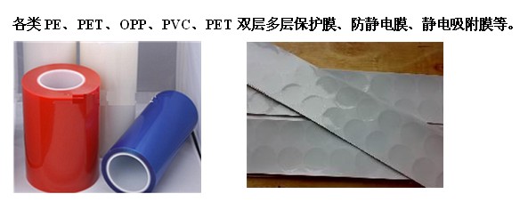 各類PE、PET、OPP、PVC、PET雙層多層保護(hù)膜、防靜電膜、靜電吸附膜等
